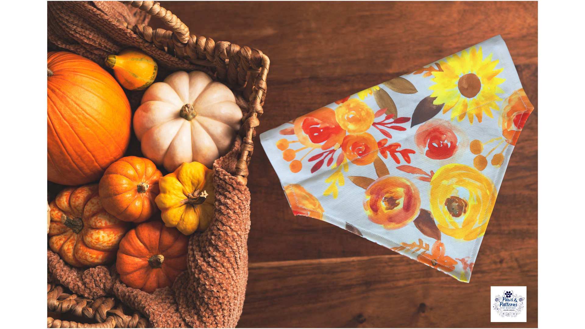 Let your pup wear the colors of the season with our Golden Bloom Pup Bandana- a radiant mix of sunflowers, autumn roses, and leafy accents that capture fall's golden hour. With it's watercolor style florals in rich yellows, oranges, and reds, this bandana brings a touch of garden whimsy to every walk and wag.