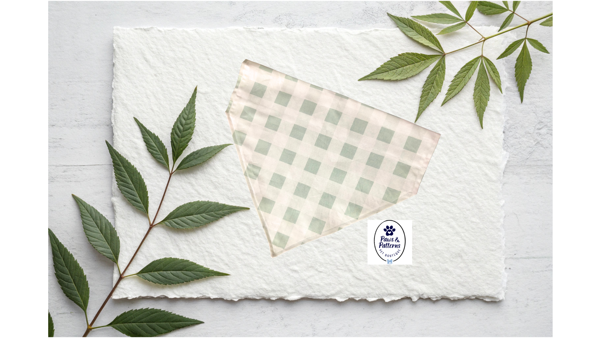 Let your pup wander into spring with this handmade reversible bandana, inspired by forest strolls and fresh beginnings. On one side, there is a cheerful light green gingham pattern that adds a classic, playful twist to the look, and the other side displays a soft botanical print featuring pinecones, leaves, and florals in muted greens- perfect for pups who love a touch of nature!