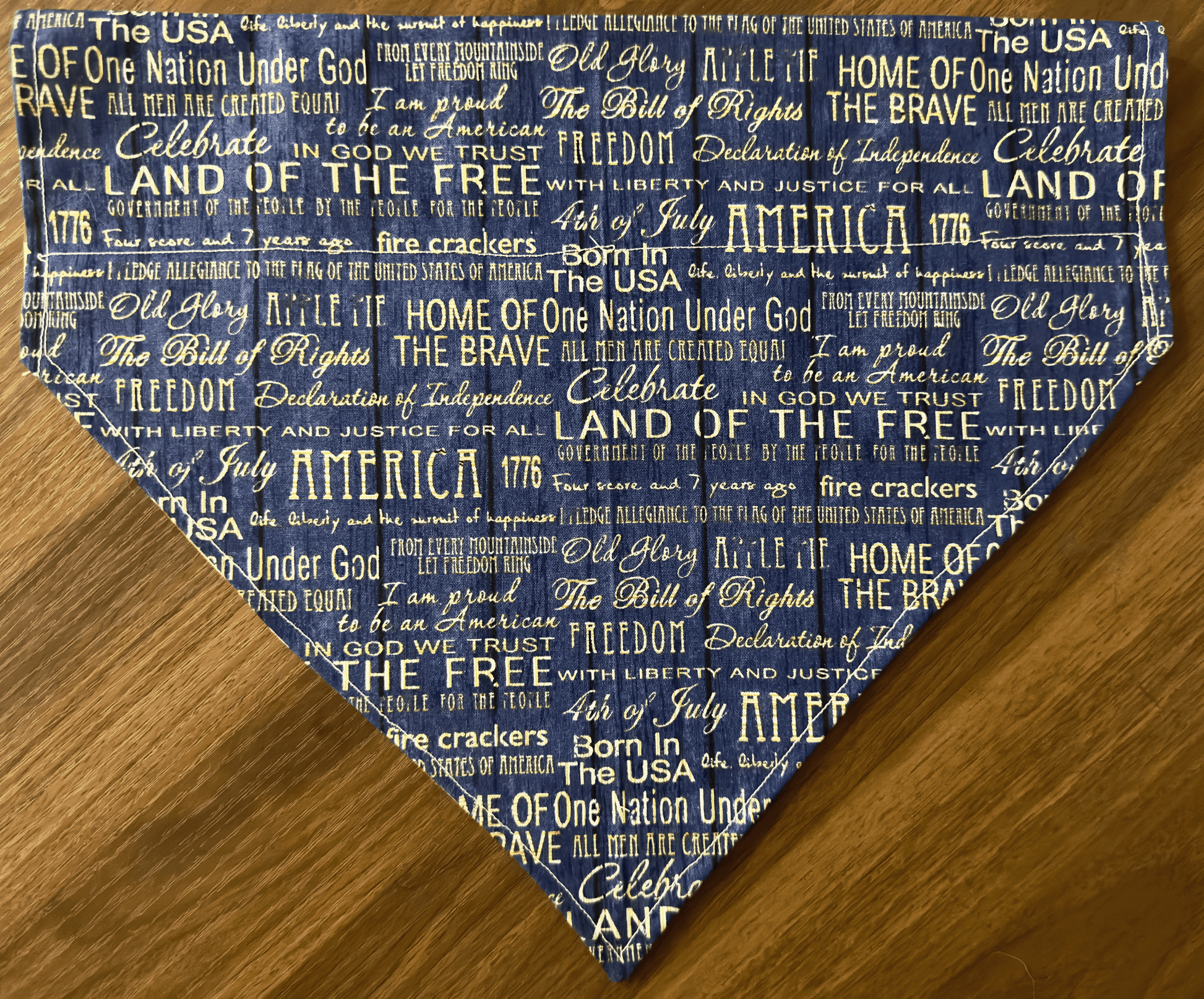 Celebrate freedom in style with this handmade reversible bandana, perfect for pups who love to show off their patriotic spirit! While the front features a classic patchwork of American flag motifs- bold stars and vintage-inspired stripes- honoring tradition and charm, the back features a heartfelt collage of iconic patriotic phrases printed in crisp white on a navy background.
